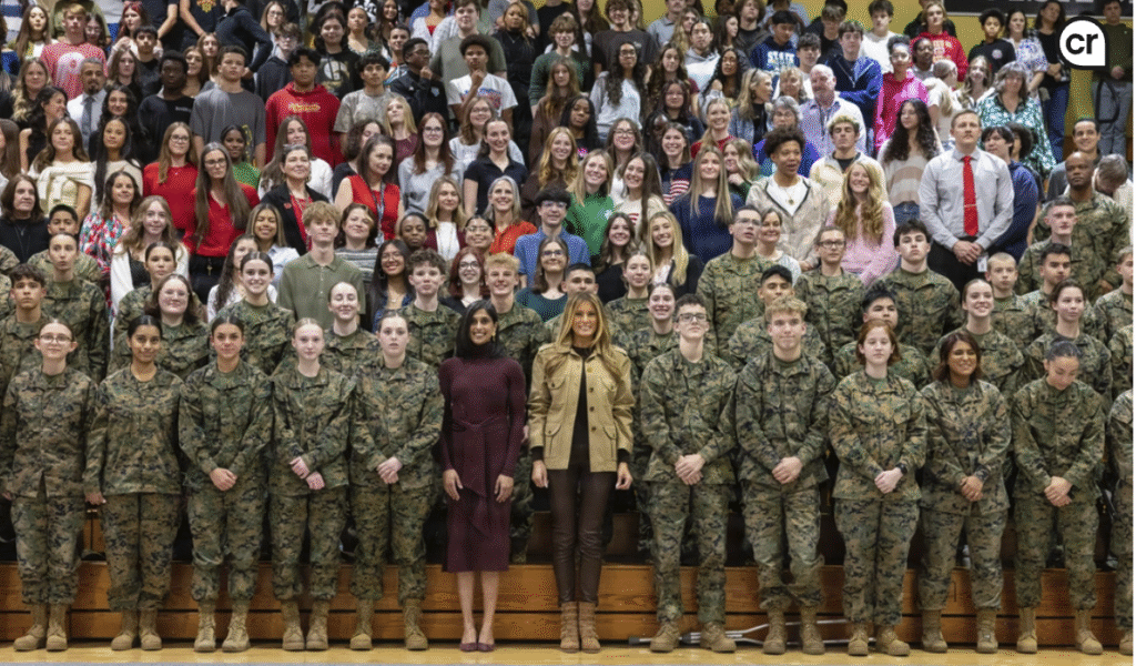 Cleary’s Notebook News (November 19, 2019) – On a crisp autumn day, the First Lady of the United States, Mrs. Melania Trump, alongside Second Lady Mrs. Usha Vance, brightened the atmosphere at Lejeune High School on Marine Corps Base Camp Lejeune, North Carolina. This visit, which took place on November 19, 2025, marked a significant occasion as it was their first outing to a military installation during the second Trump Administration, dedicated to honoring the brave men and women in uniform and their families during the festive season.